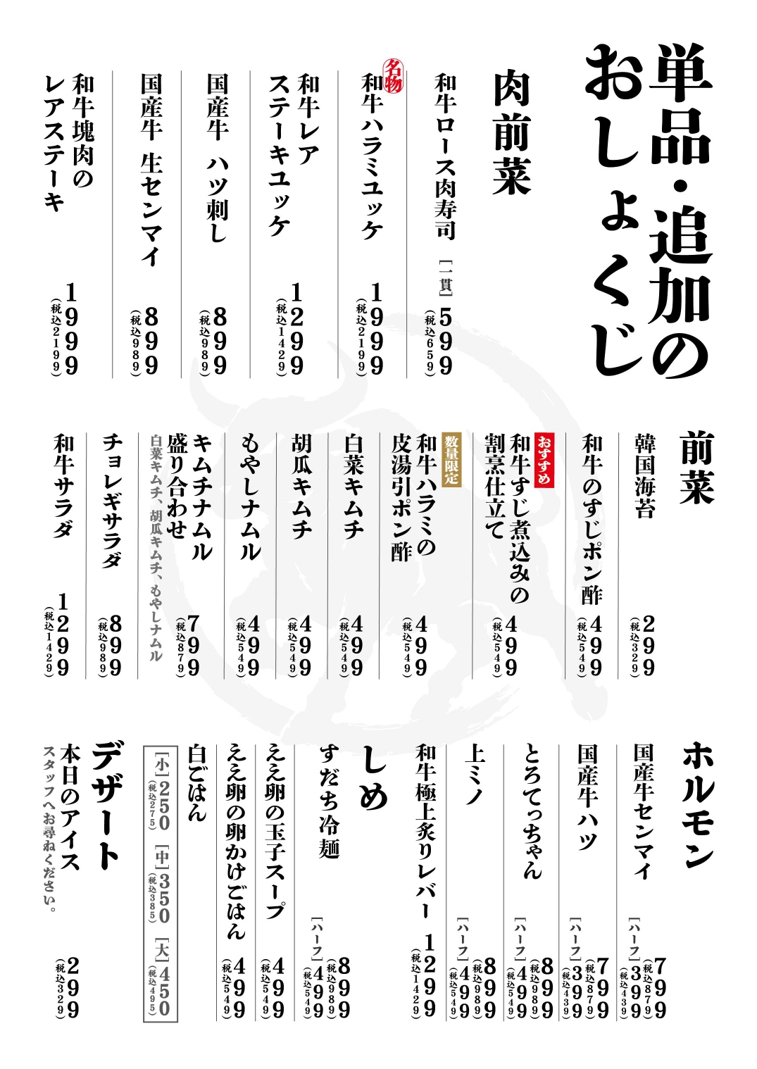 極上の和牛コースを堪能し、たらふく呑んでも税込一万円以内です。ご飯お代わり自由で満腹保障!