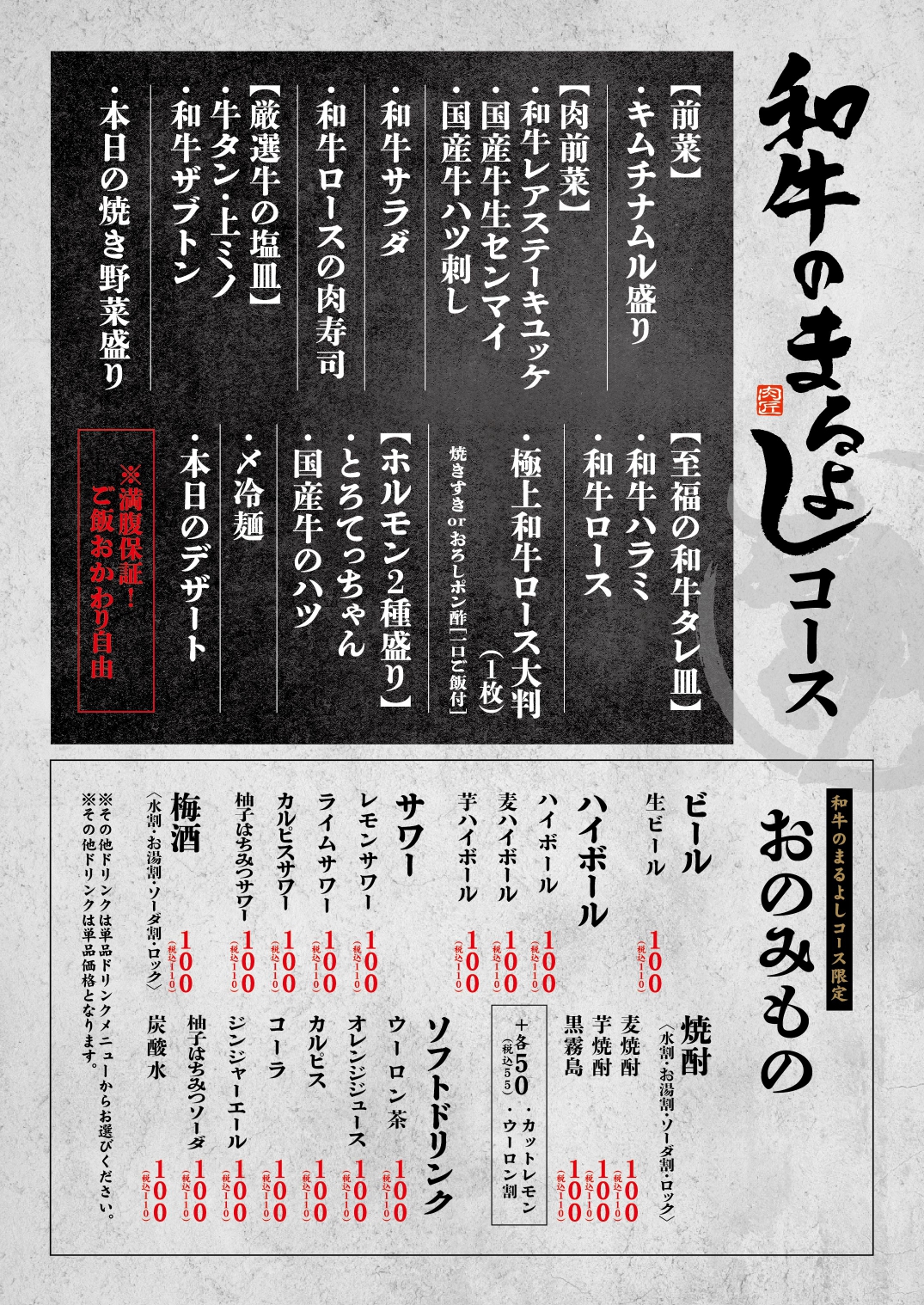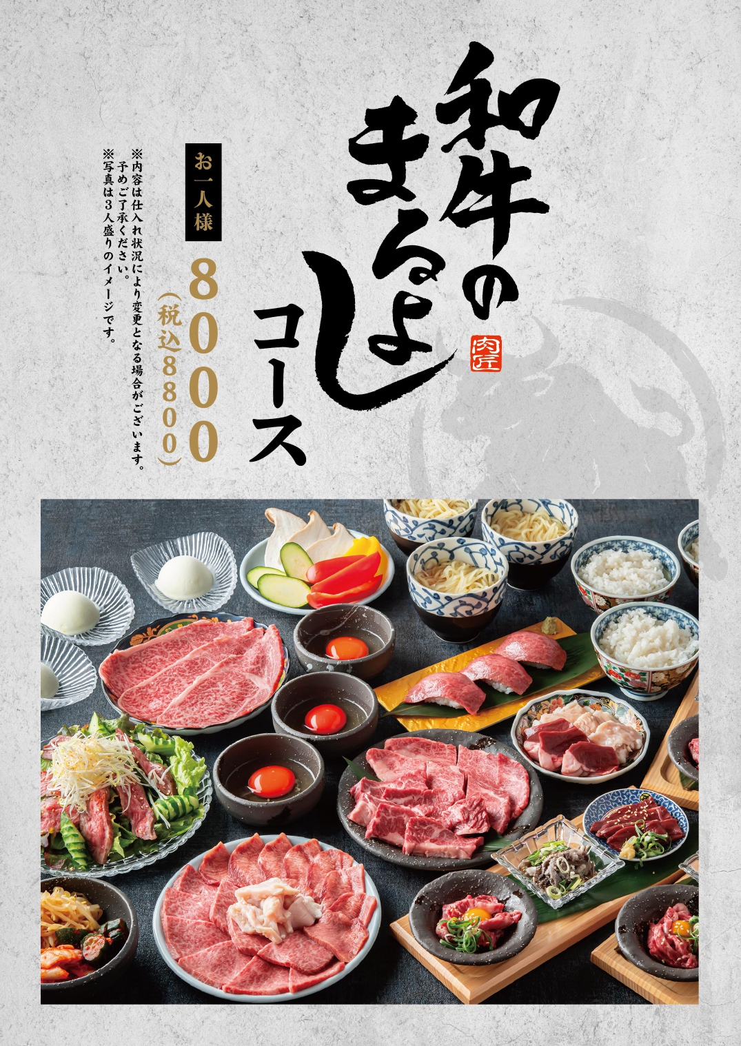 まるよし精肉店直営だからこそ実現!厳選仕入れした和牛をお値打ち価格で提供させて頂きます。極上の和牛コースを堪能し、たらふく呑んでも税込一万円以内!満腹保障!ご飯お代わり自由です。