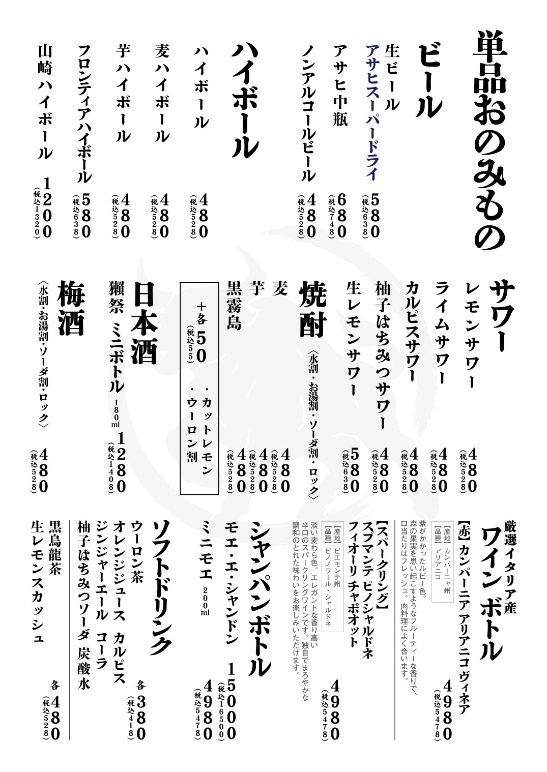 ※コースドリンク10杯以上、対象外ドリンク単品メニュー追加の場合は一万円を超える場合がございます。